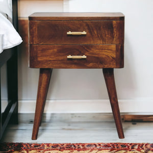 Introducing our Chestnut T-Bar Nordic Bedside, crafted from 100% solid mango wood with a chestnut finish. With 2 spacious drawers and Nordic-style legs, this eye-catching bedside provides both style and functionality. The 2 shiny gold t-bar handles add an elegant touch to any bedroom. Elevate your space with this essential piece.