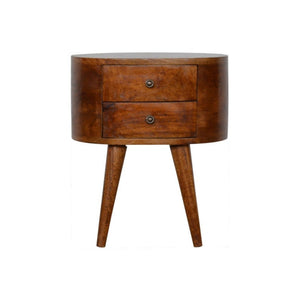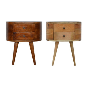 This lovely solid wood bedside has been constructed from 100% solid mango wood in an oak-ish finish and offers a unique shaped design with rounded edges. It features 2 mini drawers which come with a shiny brass knob and Nordic style legs.