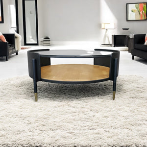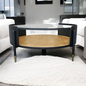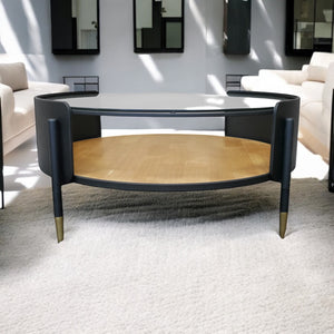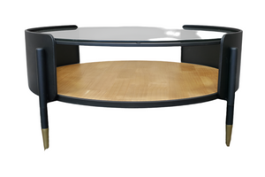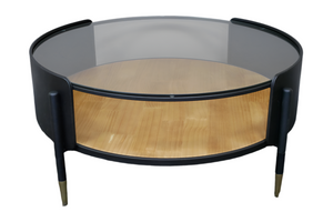 Introducing our elegant Black Coffee Table, featuring a modern design with a circular glass top and oak base. Perfect for any contemporary space, this table stands at 40cm tall and measures W: 80cm D: 80cm. Elevate your living room with this stylish addition.