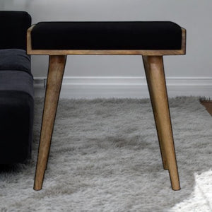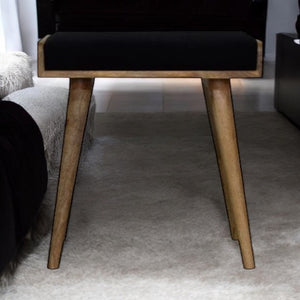 It has an upholstered black top that works as a comfortable seat and can be incorporated into many different interior styles as it offers a very clean and modern design, along with providing a nice contrast between the material and wood.