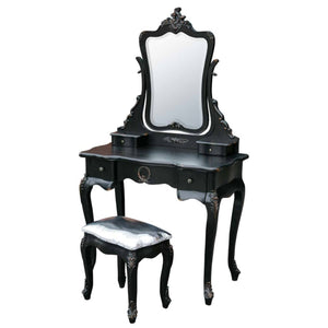 This Boudoir Provence Dressing Table with Mirror in black brings a touch of elegance to your bedroom. The set includes a dressing table, mirror, and stool, all featuring intricate handmade details and an antiqued black finish. With ample drawer space and a stylish French design, this dressing table is a must-have for any bedroom.