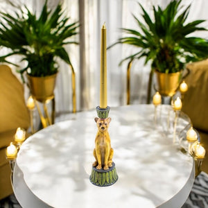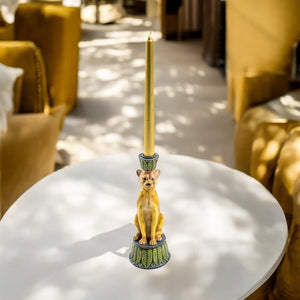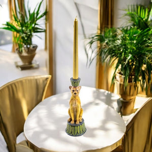 Add a touch of wild to your home decor with our leopard candle stick holder! This unique and detailed piece is the perfect addition to any table or room. Standing at 25cm tall and 9cm wide, it's a fun and stylish way to display your favorite candles. Elevate your space with this fierce and eye-catching statement piece!