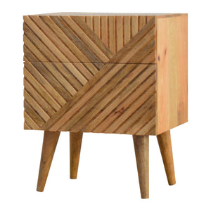Add this unique solid wood bedside to your bedroom, constructed from 100% solid mango wood in an Oak finish, this piece features a very unique line hand carved design on the drawer fronts with a clean finish meaning easy access into the drawers without any knobs.
