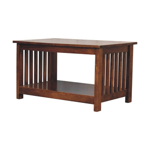 Crafted from 100% solid mango wood, the Chestnut Oak Coffee Slatted Table boasts a stunning side-slatted design and a rich chestnut finish. With 4 straight feet and ample space underneath, this coffee table is both stylish and functional, making it the perfect addition to any living room.
