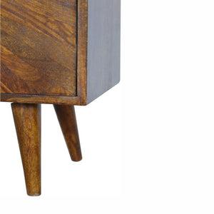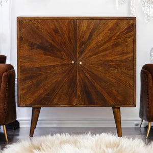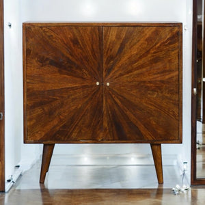 This cabinet has been designed to provide a convenient storage space for your home. It has been constructed from 100% solid mango wood in a dark chestnut finish with a sunrise pattern followed by shiny candle knobs.