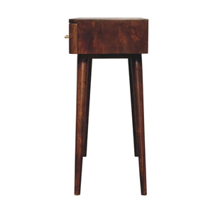 Add a touch of elegance and functionality to your home with our Chestnut T-Bar Console Table. Made from 100% solid mango wood with a chestnut finish, it boasts 2 spacious drawers and Nordic-style legs. The shiny gold T-bar handles add a stylish flair. Perfect for your hallway or living room, it provides a convenient storage solution while adding a chic touch to your space.