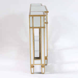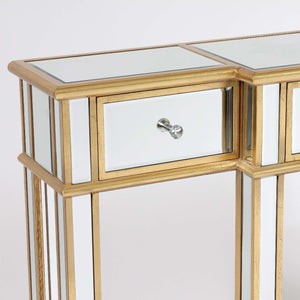 Mirrored panels with Gold trim. 3 Drawers. 1 shelf.