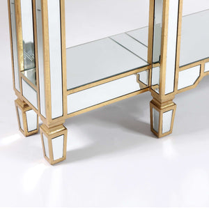 It features an antique Venetian pillar design with an open shelf. The console table comes with an elegant and reflective silver mirrored glass finish, which is framed by silver gilt trims.