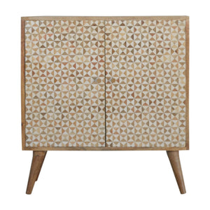 This cabinet has been constructed from 100% solid mango and features a unique design made from a wooden inlay of little white resin pieces to create a dimensional look.