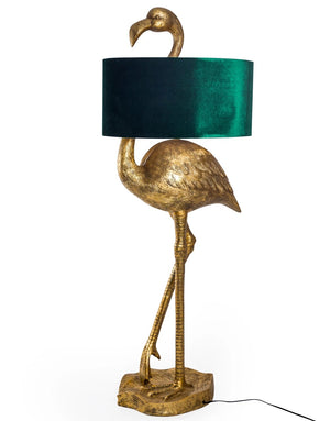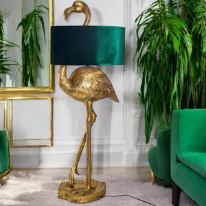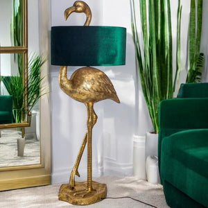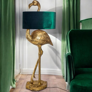 Illuminate your space with our Golden Flamingo floor standing lamp. The elegant golden flamingo base paired with the emerald green shade adds a touch of sophistication to any room. Enjoy the perfect combination of style and practicality.