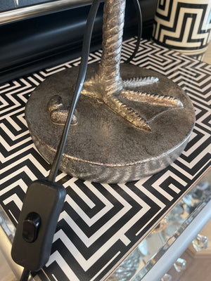Illuminate your space with our stunning Flamingo Table Lamp. The sleek silver base effortlessly complements the light sage green lampshade, adding a touch of elegance to any room. Enjoy the perfect balance of style and functionality with this unique lamp.