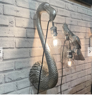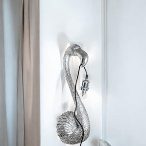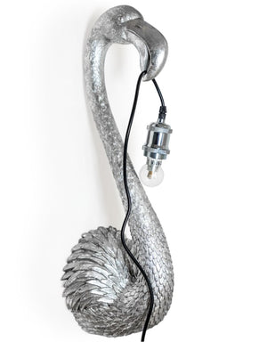 Elevate your home decor with our modern Flamingo Wall Light. Made of sleek silver metal, this unique piece adds a touch of fun and elegance to any room. Perfect for those looking to make a statement in their home.Beautiful and Unique Silver Flamingo Wall Light.