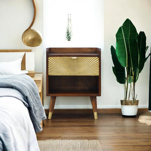 Introducing our Golden Bedside Table, the perfect addition to your bedroom. This beautifully crafted chestnut table features a luxurious golden-plated drawer and open slot for all your bedside essentials. With its rich finish, cap feet, and Nordic style leg, it combines both style and function. Elevate your bedroom with our Golden Bedside Table.