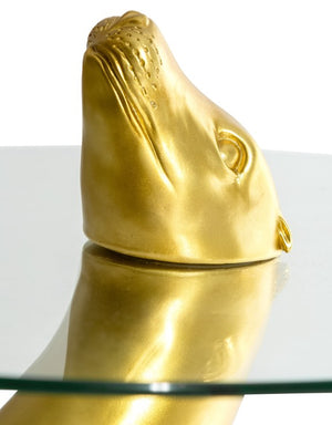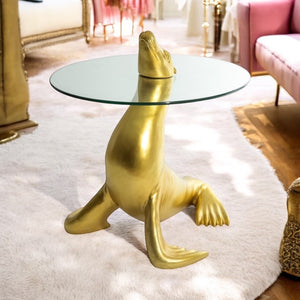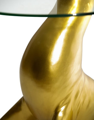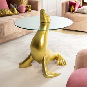 Expertly crafted, the Golden Seal Side Table features a glass circular top paired with a stunning golden seal design. Its unique appearance makes it an ideal centrepiece for any room, adding both elegance and functionality. Expertly crafted with precision, it is sure to make a statement in any space.