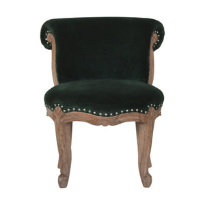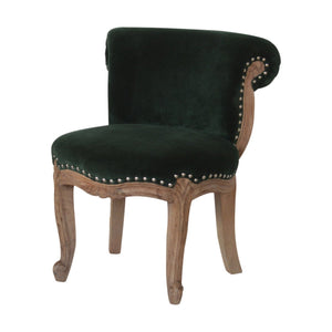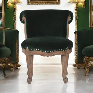 Make a statement with this Green velvet studded chair that adds both class and style to your home. The vibrant green fabric is beautifully upholstered and complements the studded design, giving the chair a one-of-a-kind and chic appearance. Its sturdy wooden legs, made of 100% solid mango wood, ensure durability and versatility for any home setting or interior. This trendy and timeless green colour is a favourite among modern homeowners.