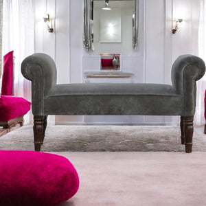 The Grey luxurious bench is the perfect addition to your home, whether it's placed in a hallway, at the end of a bed, or anywhere in your living area. Made of 100% solid mango wood with sleek turned legs, this stunning piece is upholstered in beautiful cotton velvet. Not only does it add a touch of colour to any room, but it also provides additional seating wherever you need it. Available in a variety of colours, this bench is sure to enhance your space. Please keep in mind that production and delivery may take 6-12 weeks for this item.