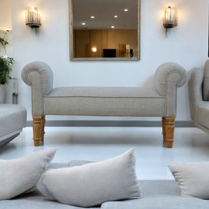 Upgrade your seating with our expertly crafted Grey Tweed fabric bench. This stylish piece features a sleek grey tweed fabric that adds a touch of sophistication to any space. Available for pre-order only. Don't miss out on this must-have piece for your home.