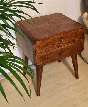 Chestnut finish Oak bedside Table unit/ perfect for bedside storage. Endlessly versatile, this curved bedside table makes a perfect stand for nibbles, drinks or a lamp. It will prove handy all over your home and is made from 100% solid mango wood and has a fine oak-ish finish. It has curved edges which will fit into any home/living space.