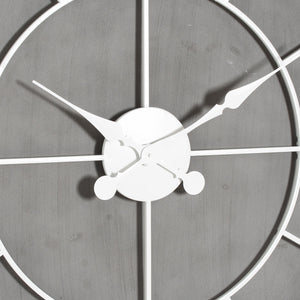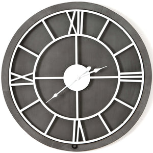 An eye-catching round wall clock which will fit with a variety of decor schemes. The white metal roman numerals and movement gains great stand-out against its grey painted wood surround.