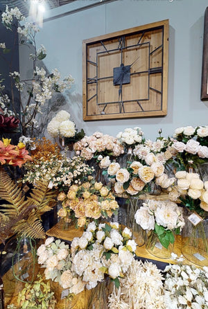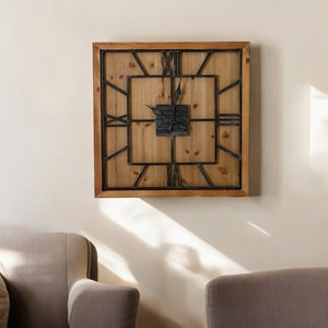 An eye catching wall clock comprised of a wooden base overlaid with a roman numeral clock face in a contrasting grey metal.