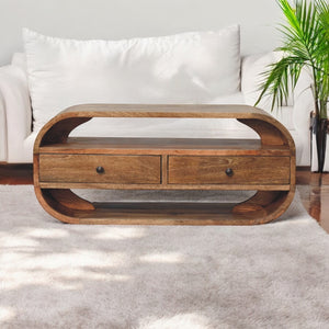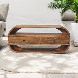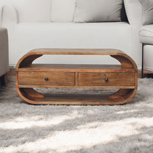 Introducing the Curved - Media Stand Oak: a stunning TV stand crafted from 100% solid mango wood with a beautiful oak finish. Its rounded edges add a unique touch to any living room, while the 2 drawers and 2 open slots provide ample storage space. Measuring W 80cm x H 35cm x D 30cm, this media stand is a simple yet stylish addition to your home. Don't miss out on this must-have piece for your living space.