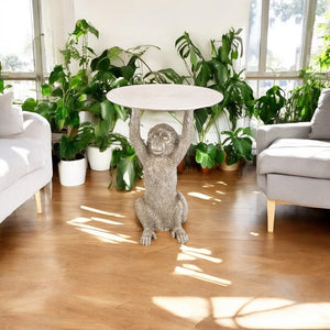 Introduce a touch of whimsy and elegance into your decor with the Monkey Side Table in Silver. Standing at 52.5cm, this playful and meticulously crafted piece features a monkey holding a circular table top, perfect for displaying items or serving as a unique side table. The silver finish adds a modern twist, making it a striking and functional addition to any interior.