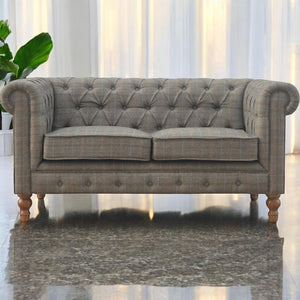 This Chesterfield double seater sofa has been generously upholstered in multi tweed fabric and is constructed from a 100% solid mango wood.