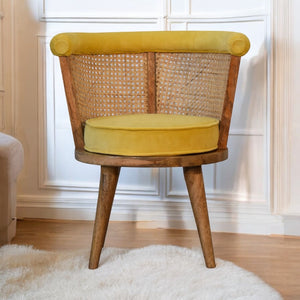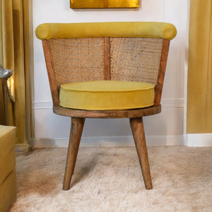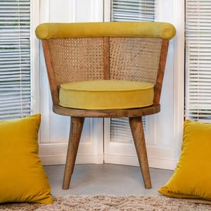 Add a pop of colour to your living space with the Mustard Rattan Nordic Chair. This chair offers a fun and trendy seating experience with its versatile, woven rattan design in a vibrant mustard shade. It's the perfect statement piece for any room that needs a playful touch. The comfy seat and unique design make it a great addition for gatherings with friends and family, and its cotton velvet fabric adds a touch of modern elegance to any living area.