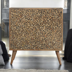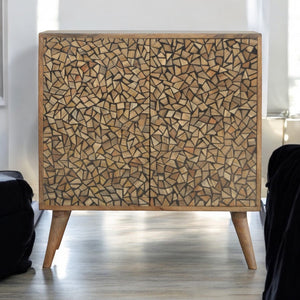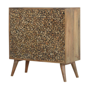 This cabinet has been constructed from 100% solid mango and features a unique design made from little resin pieces to create a dimensional look.