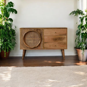 Turn heads with this Oak sideboard! Its sleek design and unique rattan details make it a standout in any space. Don't be fooled by its understated appearance, this sideboard offers ample storage with its three spacious drawers. Whether in your hallway, kitchen, or living room, this solid mango wood piece with Nordic-inspired legs will add a touch of originality to your interior.