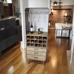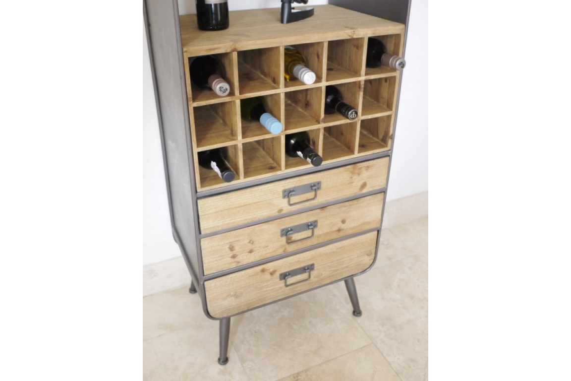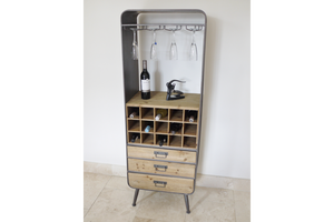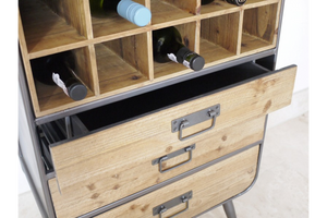 This one-of-a-kind drinks cabinet features a vintage industrial design, perfect for hosting gatherings with loved ones. Crafted from fir wood and iron, it boasts stability and durability that will last. Dimensions of H: 159cm W: 56cm D: 38cm and a weight of 27kgs.