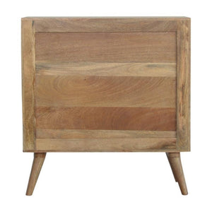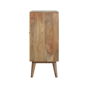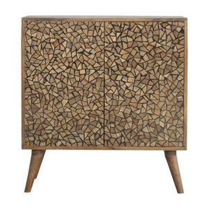This cabinet has been constructed from 100% solid mango and features a unique design made from little resin pieces to create a dimensional look. It has Nordic-style legs and round shiny brass knobs. This wooden sideboard is perfect for a living room or a bedroom.