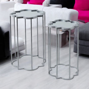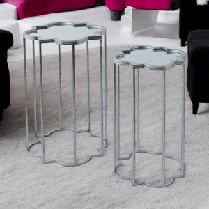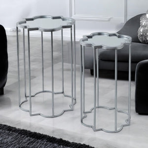 These silver curved side nest of tables add a touch of elegance to any room. Made with a silver gilt leaf style finish, the curved design and glass top offer a modern twist on traditional nesting tables. Perfect for compact spaces, this set of two tables is both practical and stylish.