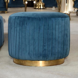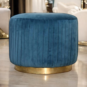 This beautiful and fashionable footstool will make the perfect addition to any bedroom or living room. It has been upholstered in a luxurious teal cotton velvet fabric with a pleated design featuring a gold brass base. Perfect for putting your feet up, using as a handbag stand, or as an accent piece in the home.