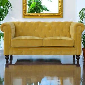 This beautiful 2 Seater Chesterfield Sofa has been upholstered in a luxurious mustard yellow cotton velvet and features 4 turned feet constructed from 100% solid mango wood in a walnut finish. This sofa is detailed with deep button tufts, piping and sheltering arms.